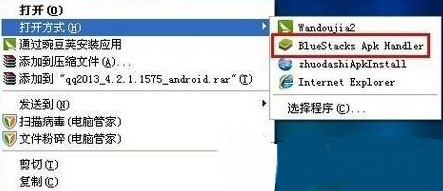 5、在豌豆荚或者360手机助手下载天天逆战的APK安装包到电脑上,使用鼠标右键打开APK安装包,打开方式选择使用BlueStacks打开。BlueStacks模拟器会启动天天逆战安装程序,会提示安装或取消,选择安装即可。