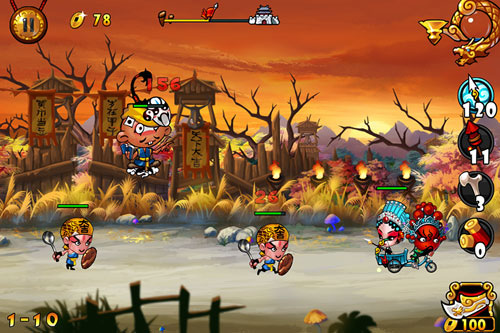 第4关狐妖和其他兵种配合出现的次数较多,且有几次狐妖结队出现的情况,使用火焰箭和闪电优先击杀狐妖;注意场面上不要积攒太多的敌人,如果情况十分棘手可以使用划砍技能。