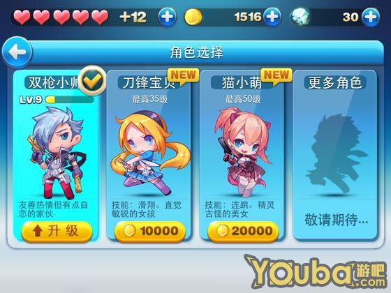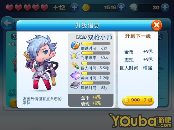 游吧小编以双枪小帅为例子,游戏系统采用了属性均衡的做法,每次升级的属性是不同。如升级到10是金币、表现分数、巨人时间的加强,升11级是冲刺、浮梯、磁铁的加强。这种做法是维持了人物角色的属性均衡,发挥角色最大的优势。