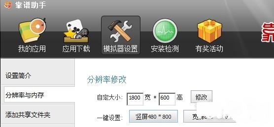 点击靠谱助手软件-模拟器设置-选择分辨率与内存-自定义修改1800*60