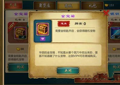 华丽的金宝箱,不知是从那个洞穴中挖出来的,里面不知道藏了什么宝物,达到vip4可在商城购买。