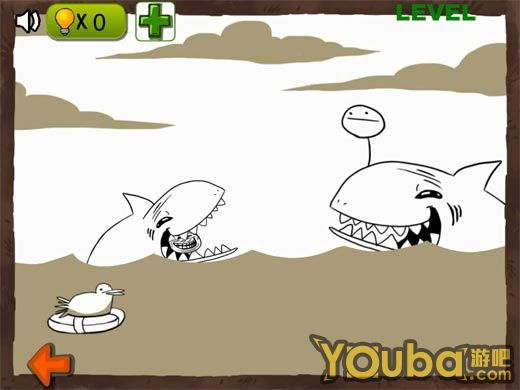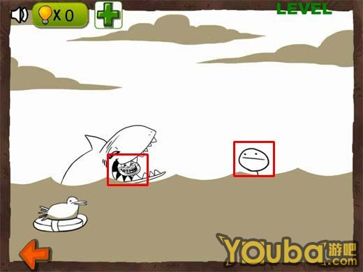 1、 先点击左边鲨鱼的嘴巴,注意是点击红色框中的位置,然后嘴里会出现一个头。