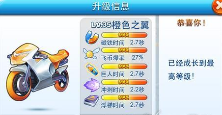 橙色之翼的好处是把一组金币吃完的奖励分*5,体积跟小绵羊差不多,18级之后车子有炫酷的花纹,如果是为了分数的话,能随随便便跑3000米以上,橙色之翼比冰原狼好,宠物是冰马不用多说,其实有时1500米左右就能明显看出橙色之翼与冰原狼的差异。