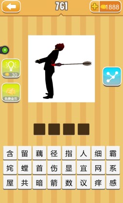 疯狂猜成语新版本加入了几十个新的成语关卡,游戏部分关卡较难,这里为你解析疯狂猜成语中,一个人腰部插着一根箭是什么成语答案。