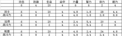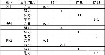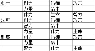 格斗之皇目前共有8项被动技能可供加点,攻击、防御、生命、命中、力量、智力、体力、耐力。其中前四项是主属性,后四项是人物属性,为什么这么说,因为人物属性是通过换算成主属性,然后再进行战斗力计算的,那力量、智力、体力和耐力如何换算成主属性呢,不同职业不一样,详细可见下表: