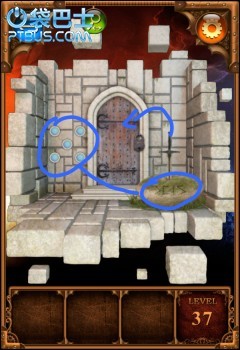 第37关:37关中可以看到岩石上有符号,具体即是左上、中间、左下、右上、右上、左下、右下、左上、右下,将正确的方向顺序输入进去,然后拿到剑即可打开铁索。