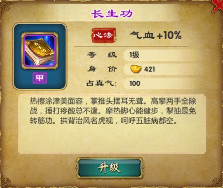 武侠Q传甲级心法长生功的效果是气血上限增加10%,占用了100的真气量。