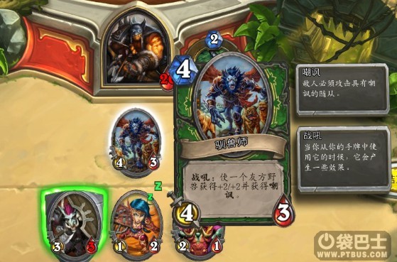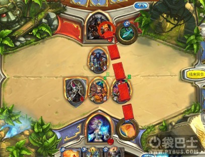 电脑使用的猎人是兽王流,拥有猎人的基本卡牌,他的特点是很容易召唤出大量低级仆从,缺点也显而易见——手牌会太少,所以我们留着魔爆术等待仆从足够后清场便能毫无压力的推倒他。