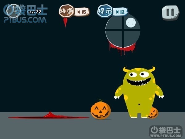 第六十三关:提示其实就是误导,将设备横向摇晃,血液中就会出现一团黑影,用手指将黑影拉出来,出现吸血鬼伯爵,蠢蠢被吓死。