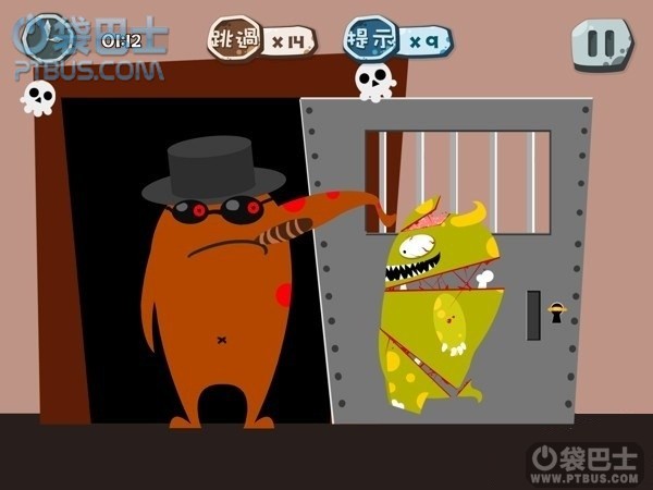 第六十四关:先点击钥匙让小怪兽取得它,然后插入到钥匙孔中,用两根手指向右滑动打开房门即可,然后小怪兽就被干掉了。