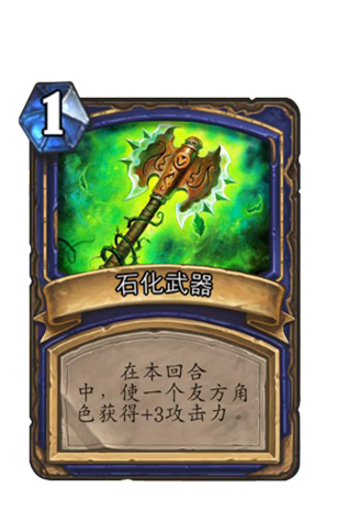 随后一费的牌包括冰霜震击、大地震击、石化武器,冰霜震击和大地震击都是造成一点伤害,但场地上如果有法伤图腾的话,可以轻易秒掉对方2血以下仆从。而如果是3血仆从的话,则是可以配合石化武器,注意实话武器是可以给仆从加,也可以给英雄加的。其它法术牌包括风怒使一个仆从获得风怒效果,但我更喜欢风语者。变妖不用说了,物美价廉和变羊术一样的优质效果。最后嗜血则是萨满的神技了,所有随从获得+3攻击力,非常恐怖。