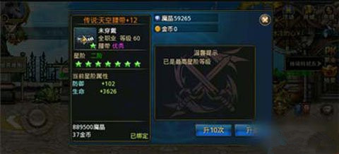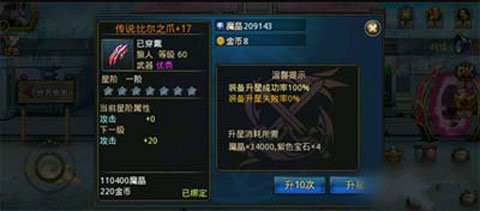 拥有以上物品,再加上点“人品”(因为有几率会升星失败...跟装备强化一样坑!)。即可加强40级以上的传说装备的属性。