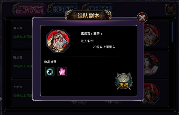 3、“普通、困难”副本每天可随时进入随时开启掉落大量丹药材料,每次进入组队副本耗费5点体力。