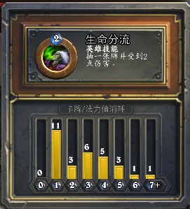 卡组的曲线是0,11,3,6,5,3,1,1。2费以下的卡牌几乎占据了卡组的一半,这样的曲线你基本只会在术士的卡组中见到,因为只有术士才能保证这么高的卡牌消耗速度。