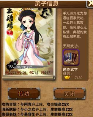 王语嫣是大掌门中比较特别的一个弟子了,基础属性很低,成长也不高,不过就凭一个技能——通晓武学(全体减防)使得她可以在血战中起到很大的作用。王语嫣不建议培养,她重点就是呆在8号位,给敌人减防。