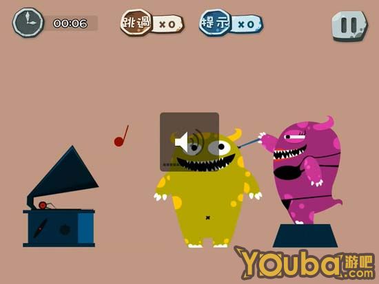 本关比较简单,我们只需要把设备的音量调到最小就可以了。左边的红色怪会慢慢的睡着,然后小绿怪就被“误杀”了。