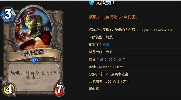 牌如其名,剑圣出场会有一个出手效果(BattleCry),受到4点伤害,变成3攻3血。3攻3血作为一个3点法力的仆从,没有其他特效,毫无优势。