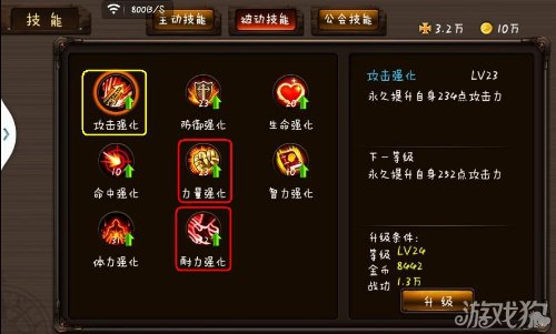 3、重头戏被动技能加点来了,以下是加点顺序,耐力>体力>力量这些是主点的技能,下面说下次要的,攻击防御生命这些点到20就够了,命中智力点到10,因为智力也会对攻击力有很小的影响。