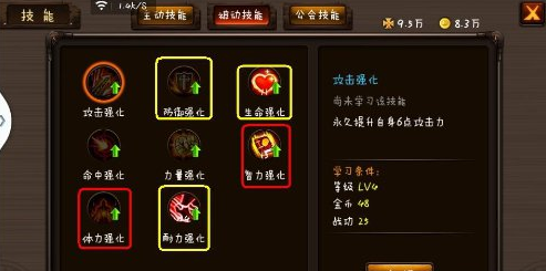 2、法师被动技能加点:图中红色为重点加,黄色为次要加。
