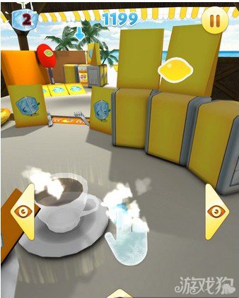 3、吃到尽可能多的分数。图中有绿柠檬、黄柠檬、薄荷叶以及额外的冰块。除了额外冰块是1000分之外,其他都是250分。有时要判断好这些加分道具的可达性,如果在规定步数内到达不了终点,那也宁愿不吃道具。冰块的分数很是诱人,如果能一发将多个冰块打到杯子里去,就更好啦!