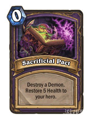 牺牲契约,术士技能,0法力水晶消耗,以牺牲一个恶魔随从为代价,为我方英雄恢复5点生命值。对于有点“自虐”倾向的术士职业来说,血量的作用非常重要,可以拿来换牌或者用于召唤随从。术士职业的场地上往往不会缺少恶魔随从,用恶魔随从换取英雄生命,作用重大。牺牲契约除了用于确保术士的生存能力外,还可以在需要时当作一种资源使用,用血来发动其他随从或技能。作为祭品来说,术士有许多低消耗的甚至免费的恶魔随从,比如我们喜爱使用的1法力水晶的嘲讽随从虚空行者,以及种类繁多各式各样的小鬼随从。