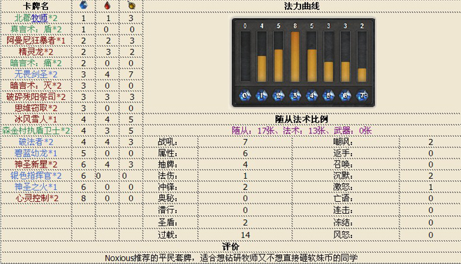 首先,因为是平民套牌,本套卡组里费用基本不超过6,主要由基础/普通/稀有卡组成,没有史诗及传说级卡牌。决不会出现先知维纶或这拉格纳罗斯之类的土豪牌。