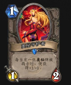 1:首先是这张卡,卡牌描述的是当有奥秘被揭示时候获得+1/1,其实游戏中是奥秘释放时候获得+1/1