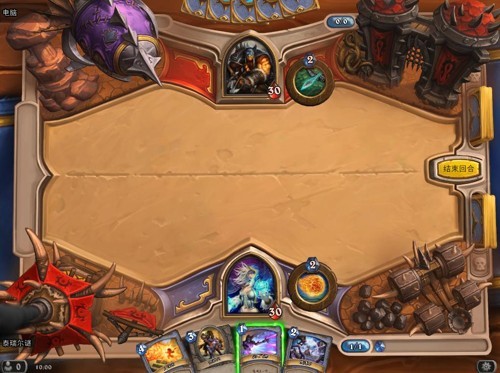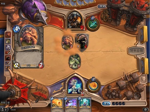 电脑使用的猎人是兽王流,拥有猎人的基本卡牌,他的特点是很容易召唤出大量低级仆从,缺点也显而易见——手牌会太少,所以我们留着魔爆术等待仆从足够后清场便能毫无压力的推倒他。