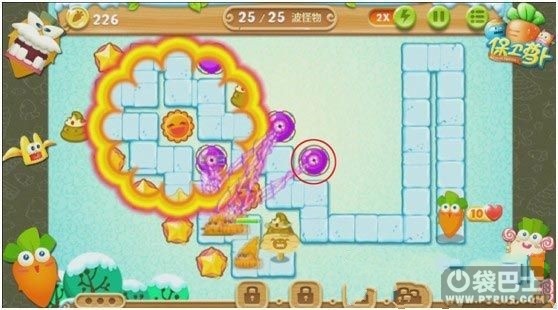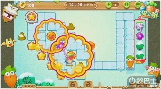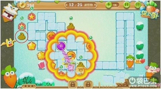 4.在图示的位置建造3个便便炮塔,此时我们要尽量先升级炸弹星。