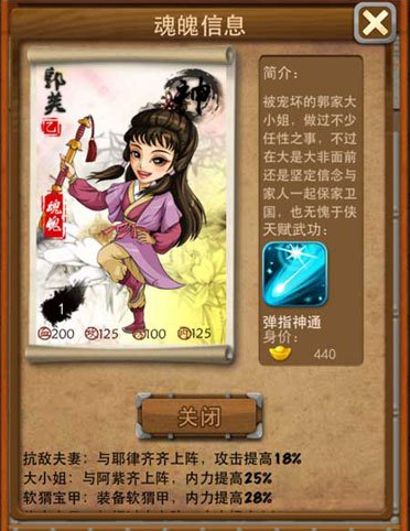 大掌门郭芙培养方向心得分享,网传《大掌门》中郭芙的总成长值奇高,达到了甲级弟子的水平,大掌门郭芙培养问题小编去看了个究竟,并做了测试,首先是基础属性:血200 攻125 防 100 内 125。