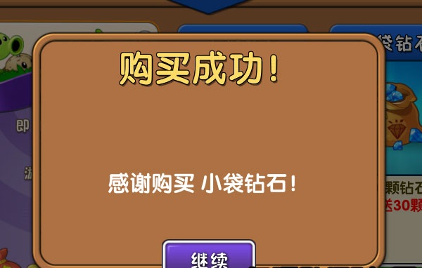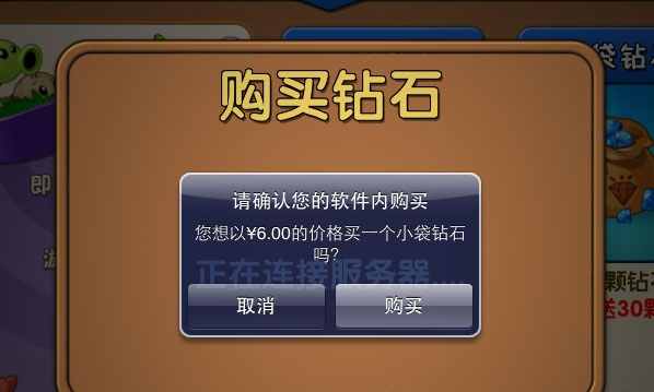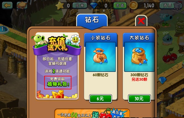在《植物大战僵尸2》中文版里面,玩家充值购买钻石,最低消费额度是6块钱人民币,对应买到60钻石。于是花了6元,测试一下那个充值植物抽奖的活动。