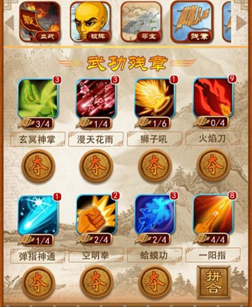 1.打江湖关卡时会掉落某些武功的残章,得到某一残章后,可在“奇遇”中找到相应的武功