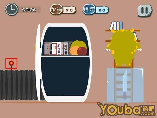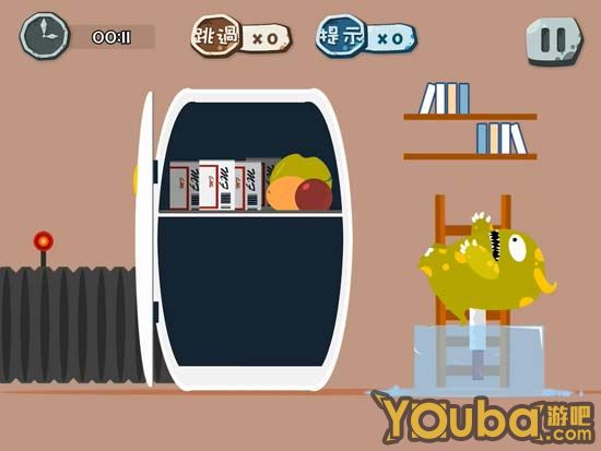 1、点击冰箱,把冰块移动到小绿怪下面,然后点击左边的红色球,冰块就会慢慢融化了。