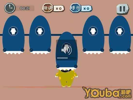 如下图,按住右边的按钮到达最高的点时松开,小绿怪就会用最大的力气打左边的不倒翁,然后小绿怪就会被压扁了。