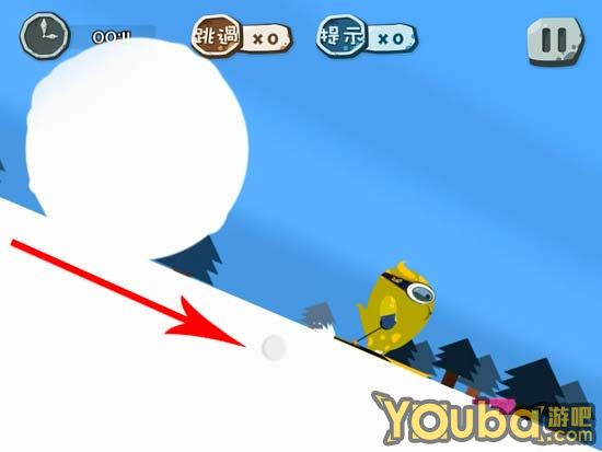 如下图所示,用一根手指按照箭头的方向一直重复滑动,而且速度要快。这样就会形成雪球,越大越好,最后就会从小绿怪身上压过去。