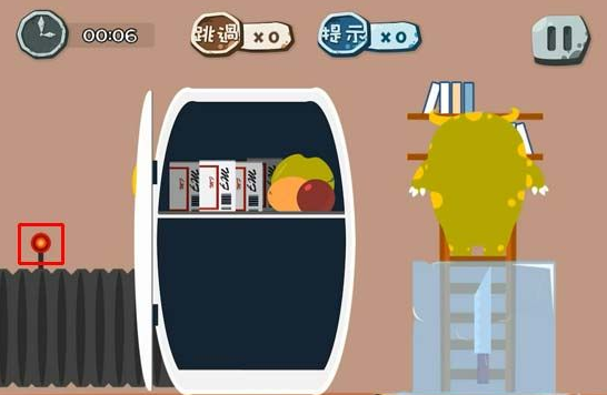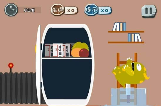 1、点击冰箱,把冰块移动到小绿怪下面,然后点击左边的红色球,冰块就会慢慢融化了。