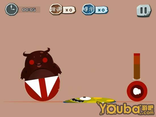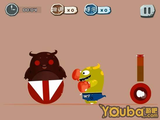 如下图,按住右边的按钮到达最高的点时松开,小绿怪就会用最大的力气打左边的不倒翁,然后小绿怪就会被压扁了。