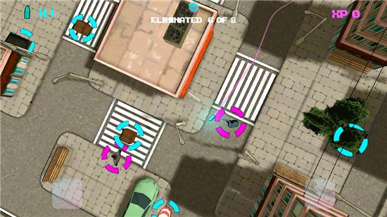 至始至终玩家都只能使用上帝视角来进行游戏,从实际体验来看,该设定也非常符合这种“让子弹飞”的题材,街道、汽车、垃圾桶以及三三两两伫立的楼房一目了然,尽管是俯瞰视角,但在贴图的质量和阴影的表达上也并没有半点马虎。不过就场景种类来说确实比较单一,除了第一场景外,其余的两个还必须使用升级获得的点数来购买解锁,至于每个大场景中的各个阶段性小关卡,也只是在物件摆设和颜色表达上有些许区别罢了。