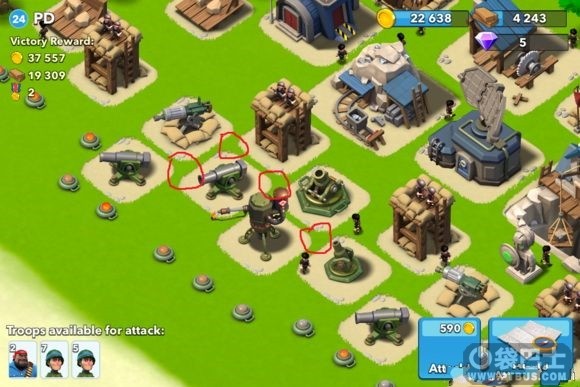 在图中画圈的地方投放弹药可以击中三个防御建筑,如果你的弹药伤害最够厉害可以直接秒掉三个防御建筑。摧毁一个建筑可以获得3个弹药的补偿。