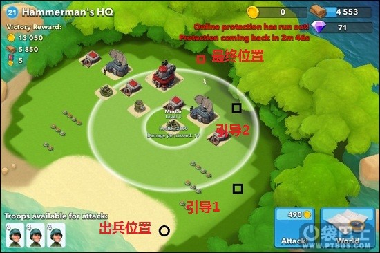 首先第一张图,看下21级boss的布局,司令部是在最里面靠近森林的地方,注意后面是没有任何防御建筑逇,在面对空地的方向倒是有几个迫击炮等防御建筑,两侧还有很多的地雷,应该没有人会傻到从地雷的方向发动攻击。