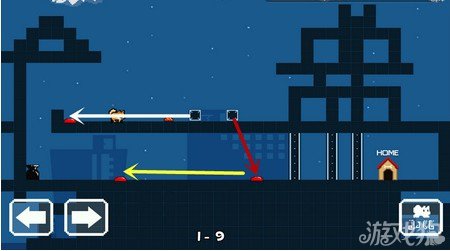 先按白色线路走,走到瓶子上往上跳,再将箱子沿着红色箭头向下推,触发上方的灯光。最后跳上上面的瓶子就到家了。