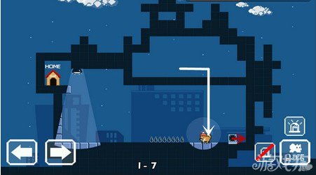 这一关,先将探灯捡起,将箱子推到白色的线条的拐角处时,开启探灯,就会下落(下方的右边有尖刺,注意躲避)。之后再将探灯丢在另一个红色的按钮上,2个铁门就打开了。顺着瓶子上跳,直接回家。