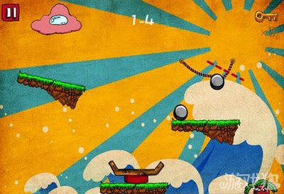 如下图所示,沿虚线切断绳子,石球会将另一颗击落至下方的平台,待石球摇摆到左侧高点时切断绳子,使两颗石球同时掉落在下方的平台从而触发机关。最后点击云朵释放水珠即可。