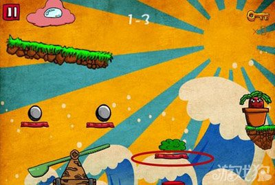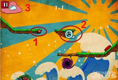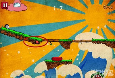 如下图所示,游戏开始时立刻点击红色标志处开启机关。待左侧的石头滚落后再次点击红色标志处所示的开关然后点击云朵释放水珠即可。