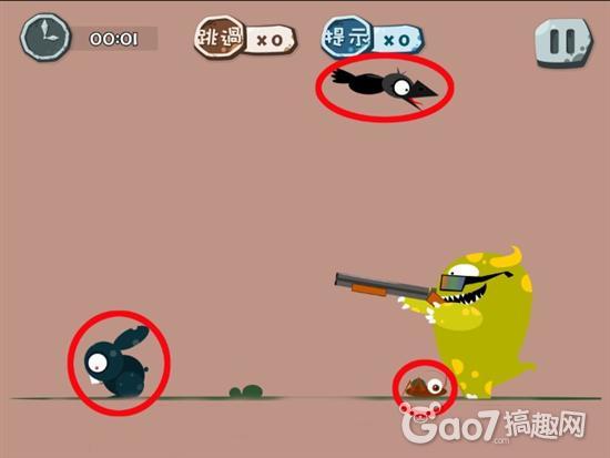 通关攻略:杀死图中所有动物,小怪兽就会被一只黑手捏死。