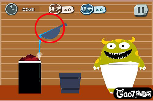 通关攻略:小怪兽在桑拿房中。我们只要将瓢子装满水倒在碳上(将瓢子遇到碳火上方松开即可)反复4死小怪兽就会被蒸熟。