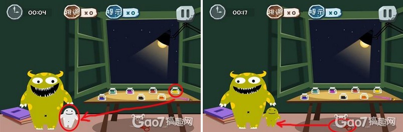通关攻略:1.点击桌子上黄色的颜料,笔沾染了颜料后拿着笔去话小怪兽旁边的娃娃。(如图1)