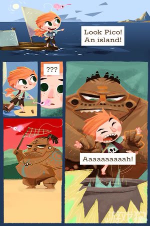 没想到这是一款全英文的游戏,小编用过了32级的英语水平跟大家解释一下第一句话,PICO快看,那里有一座岛。咦,出现一个野人。不好,被抓到了。要被吃掉。。。后来就可以莫名其妙的寻宝了。