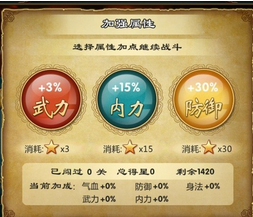 “武力”,武力是血战最重要属性之一,不过选择上要注意合理分配,只要增加到一轮下来能秒掉对手4个人以上时为最好,如果你的武力够用了,第3关以后给你30%的武力跟15%的气血选择,那么请果断选择气血。