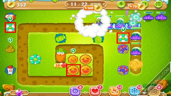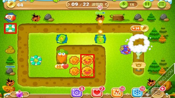 建造风扇塔(依次满级)减速怪物,太阳塔(满级)